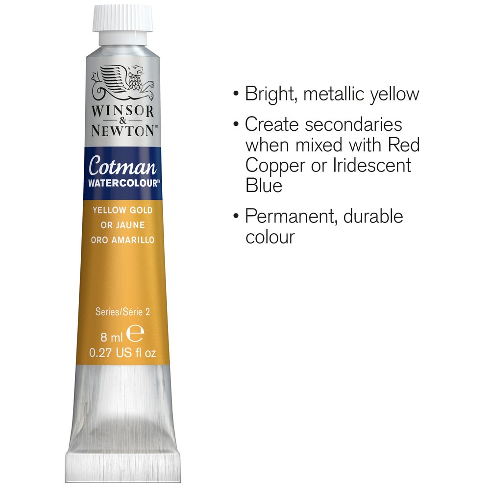 Un jaune métallique offrant une version moderne d'une aquarelle dorée historique, alors que l'on utilisait auparavant de l'or véritable. Crée un spectre de couleurs secondaires lorsqu'il est mélangé avec du Cuivre Rouge ou du Bleu Irisé.
