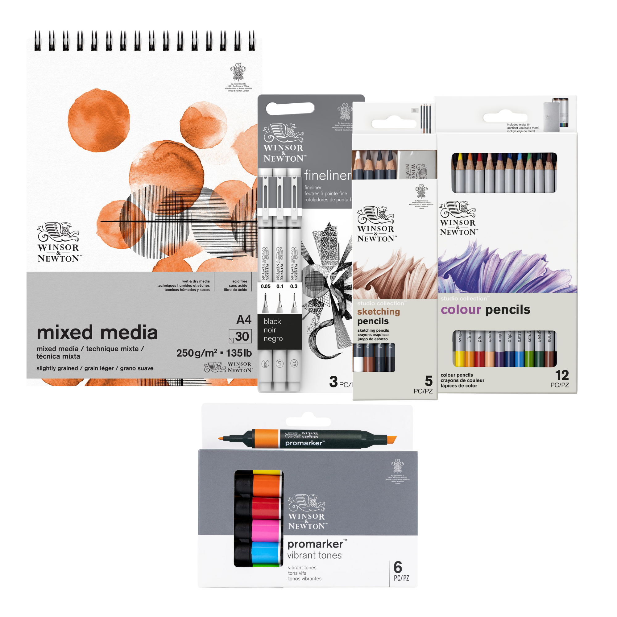 Idéal pour dessiner, griffonner, planifier ou développer des idées, ce bundle de dessin propose une sélection polyvalente de crayons, de Promarkers vibrants, de feutres fineliners et un bloc mixed media. C’est la base parfaite pour affiner vos compétences, libérer votre créativité et profiter de la liberté du dessin, quel que soit votre style.