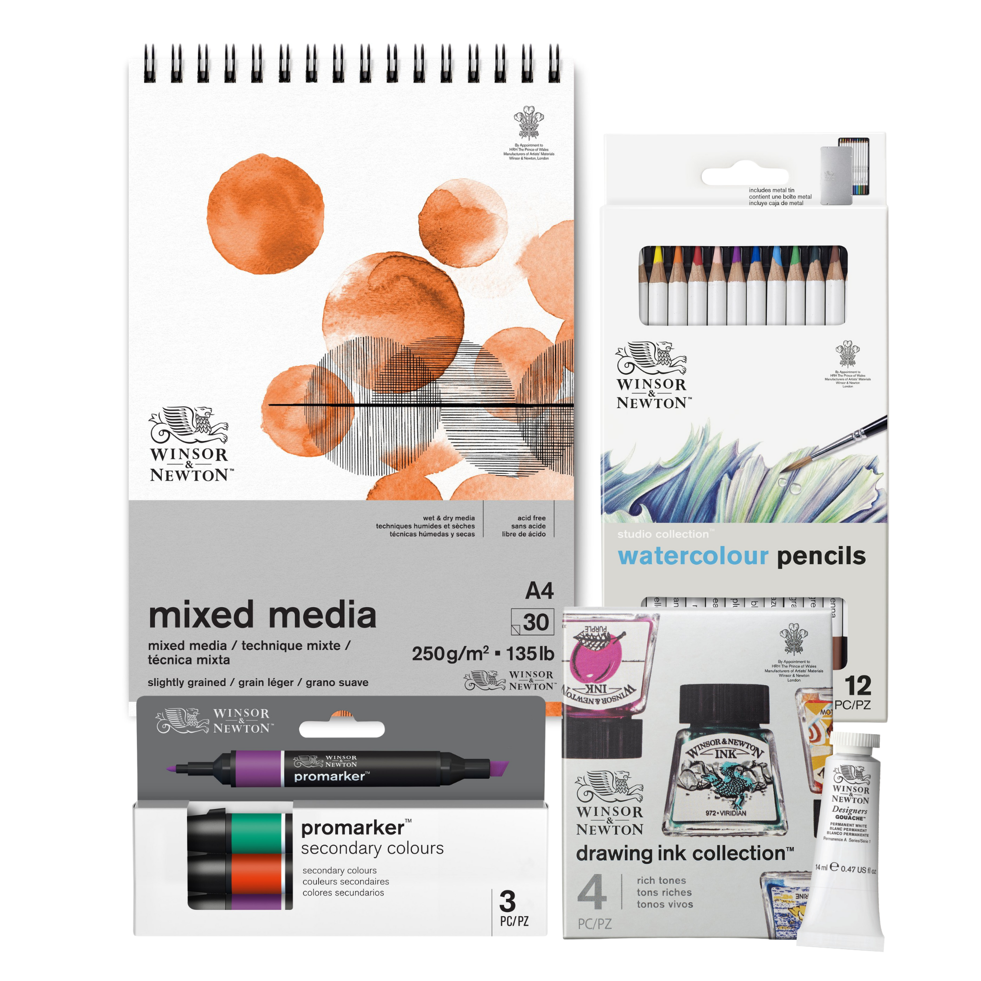 Idéal pour les créateurs curieux, ce kit de techniques mixtes encourage l'exploration de multiples médiums : encres et gouaches aux pigments riches, crayons aquarelle, feutres fins et Promarkers. Accompagné d'un bloc de papier pour techniques mixtes, il vous invite à expérimenter, superposer, combiner et découvrir les techniques qui stimulent votre imagination.