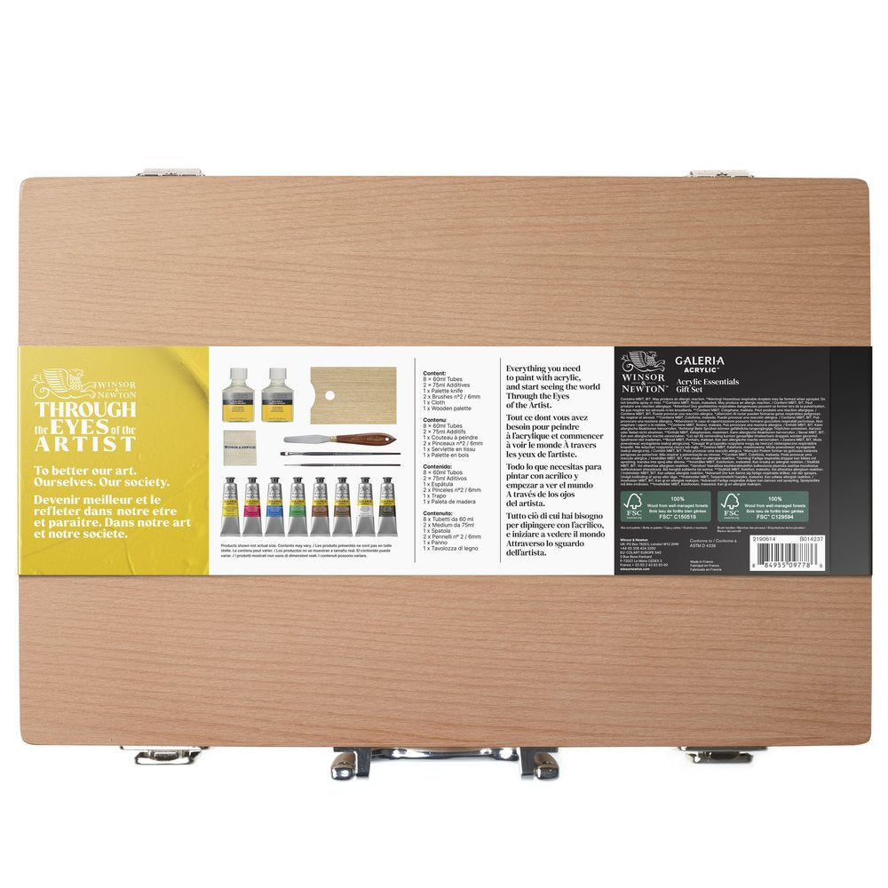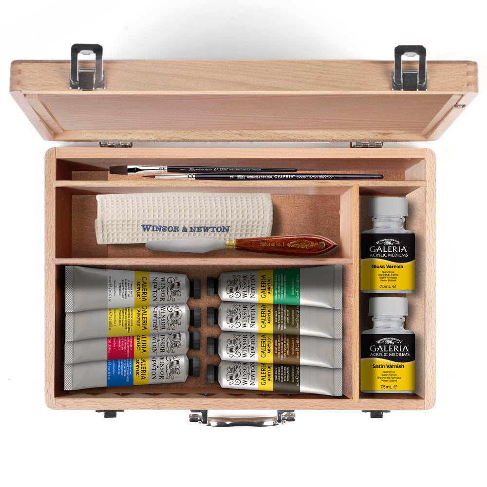 Contenu du set: | 1 each of the following Galeria Acrylic Colour 60ml tubes: Process Yellow Process Magenta Process Cyan Permanent Green Middle Burnt Umber Raw Umber Mars Black Titanium White Plus… Galeria Medium, Satin Varnish - 75ml Bottle Galeria Medium, Gloss Varnish - 75ml Bottle Galeria Synthetic Brush, Round SH - Size 3 Galeria Synthetic Brush, One Stroke SH - Size 1/4in / 6mm Winsor & Newton Metal Palette Knife No1 (3in) Piece of Cloth – Winsor & Newton Stitch Logo Wooden Box w/Easel; Beech Wood 13.4in x 8.5in x 2.8in – 60oz |