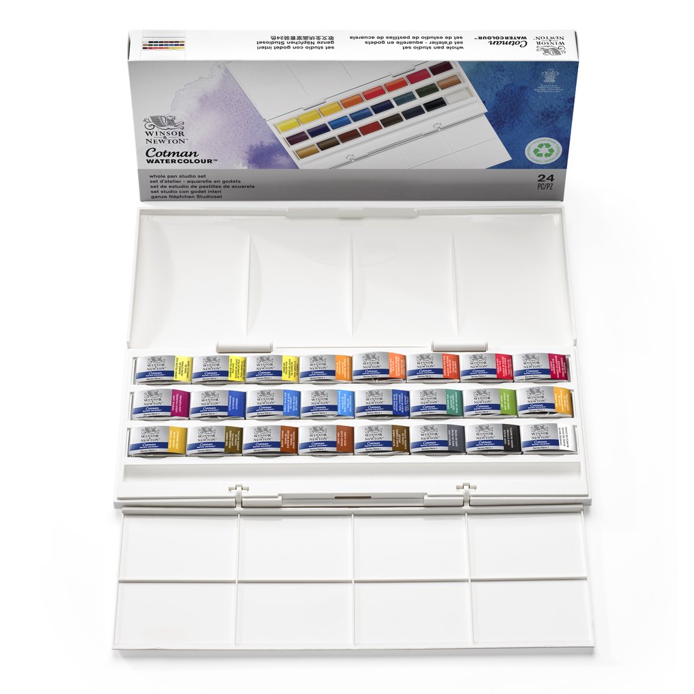 Découvrez les aquarelles Cotman fabriquées avec des pigments de haute qualité pour assurer la permanence des couleurs. Contrairement aux assortiments avec des demi-godets, cet set offre plus de chaque couleur puisqu'il contient 24 godets entiers, ainsi que des palettes avec plusieurs zones de mélange.
