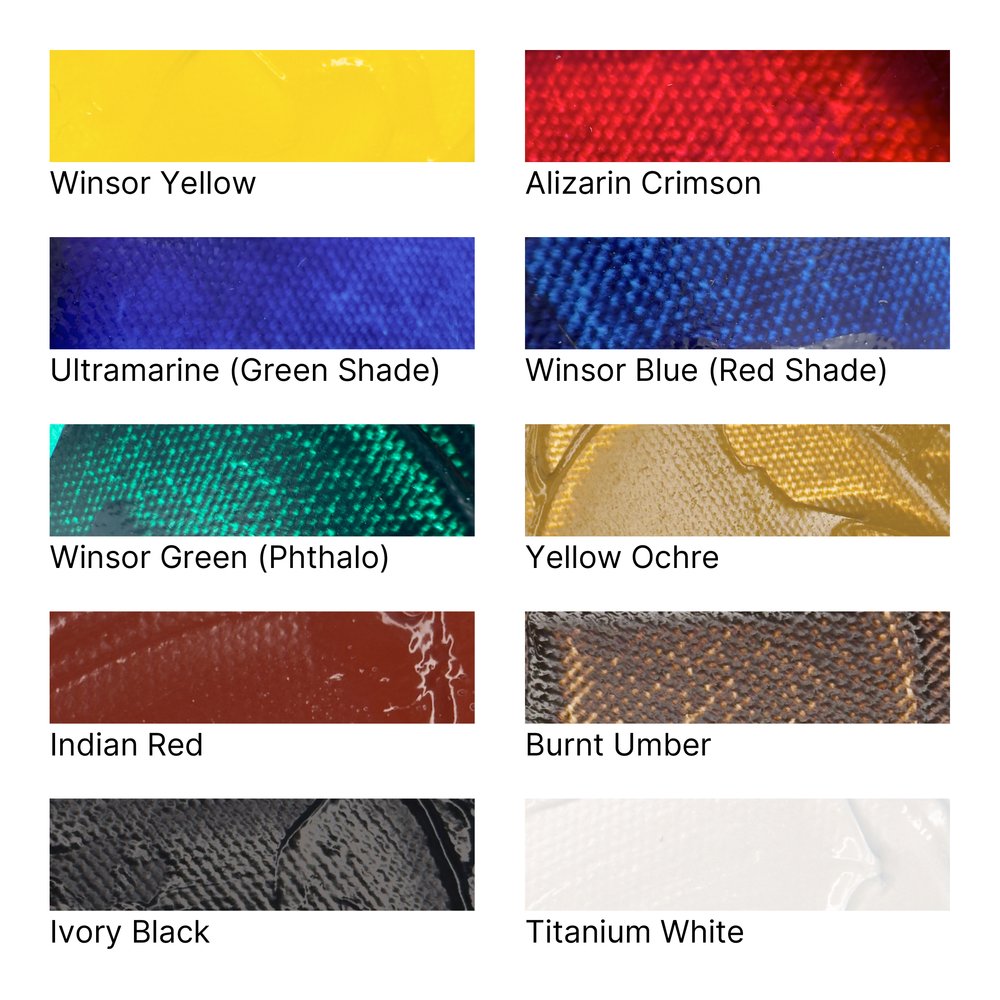 Ce set d'introduction contient une sélection plus large de 10 tubes de 21 ml de peinture à l'huile Artists'. Inclus : Jaune Winsor, Alizarine Cramoisie, Outremer (Nuance Verte), Bleu Winsor (Nuance Rouge), Vert Winsor, Ocre Jaune, Rouge Indien, Terre d'Ombre Brûlée, Noir d'Ivoire, Blanc de Titane. Le contenu peut varier.