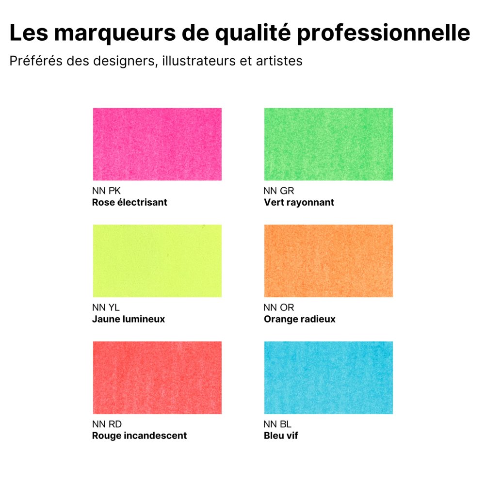 Promarker Neon propose des couleurs éclatantes et fluorescentes avec une encre de haute qualité à base d'eau. Pigmentée et résistante à la lumière, elle est parfaite pour ajouter des accents vifs, de la définition et de la texture à vos designs. Elle brille également sous la lumière UV. Chaque marqueur est à double pointe, avec une pointe plus large en forme d'ogive, adaptée au remplissage de grandes surfaces, et une plus petite pour les travaux détaillés.