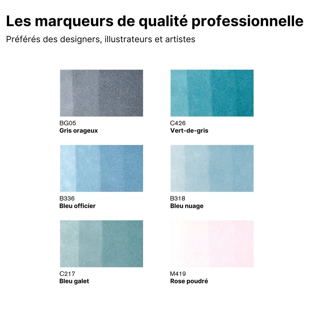Le set Tons de Ciel contient des couleurs inspirées par la nature : Bleu Cadet, Bleu Nuage, Bleu Galet, Gris Orageux, Vert-de-Gris et Bourgeon (parfaite en tant que couleur d'accent).