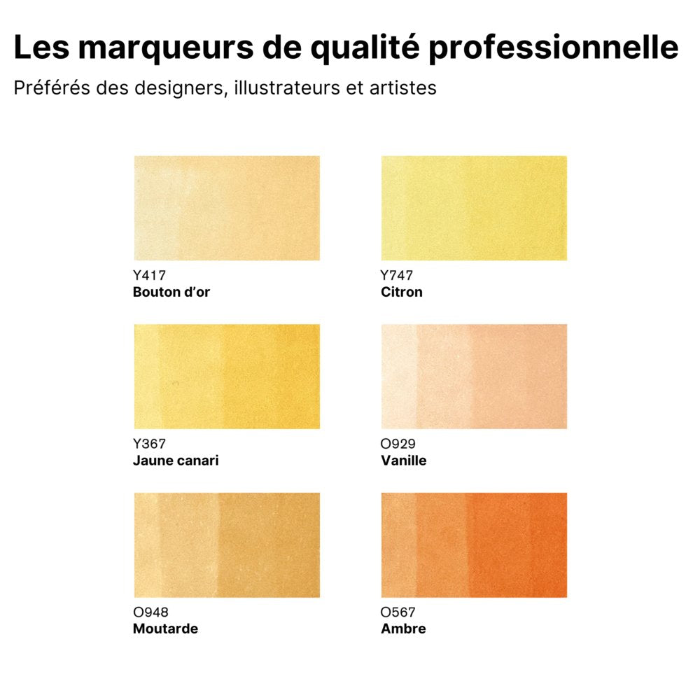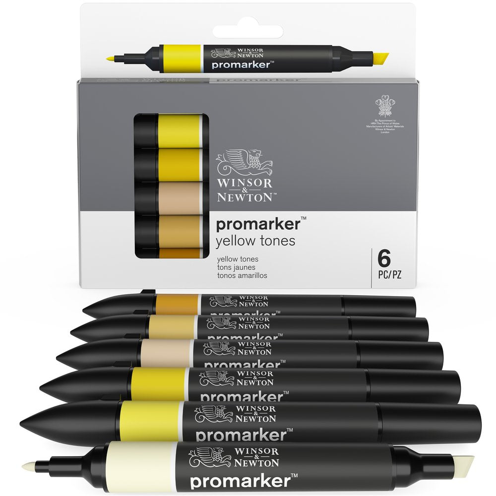 Élargissez votre collection de Promarkers avec ces 6 tons de jaune : Bouton d'or, Citron, Canari, Vanille, Moutarde et Ambre. Marqueurs à base d'alcool. Double pointe : une pointe biseautée et une pointe fine.