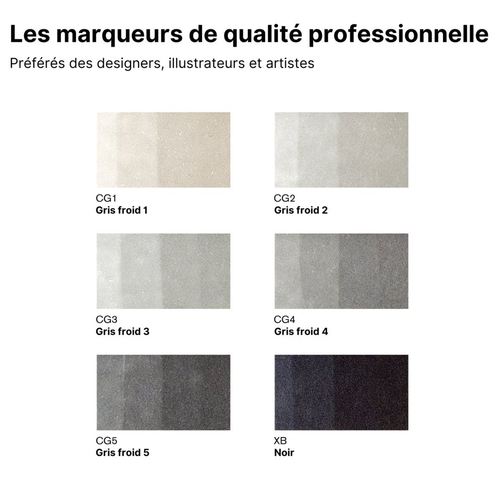 Ce set de six nuances de gris contient toute la gamme des cinq Gris Froids, et est complété par un incontournable des Promarkers : le Noir. Comme pour tous les sets Promarker, il a été spécifiquement conçu pour offrir aux illustrateurs et artistes de belles tonalités, chaque jour.