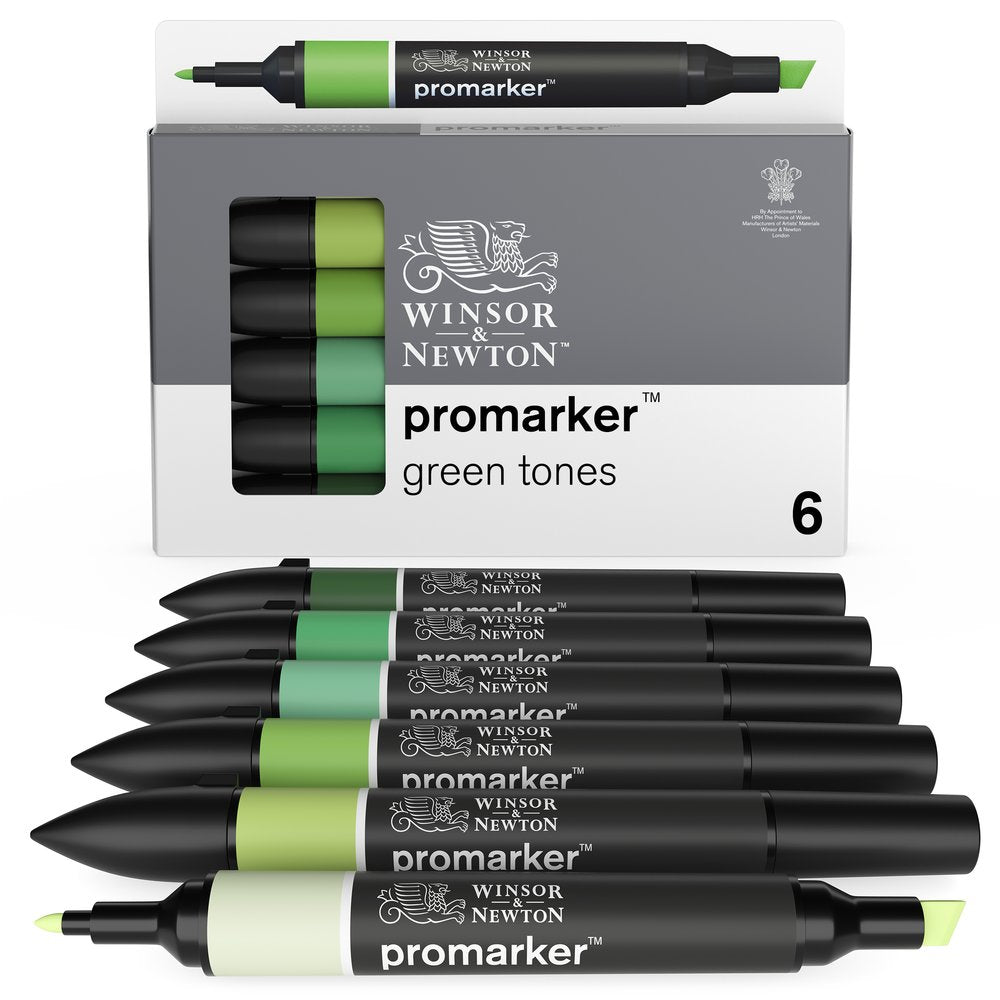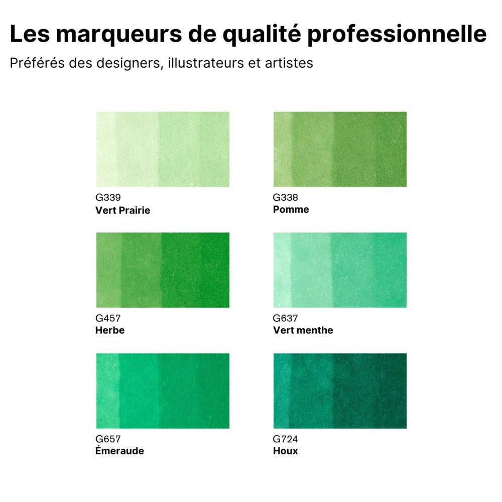 Élargissez votre collection de Promarkers avec ces 6 tons verts : Vert Prairie, Pomme, Vert Menthe, Herbe, Émeraude et Houx.