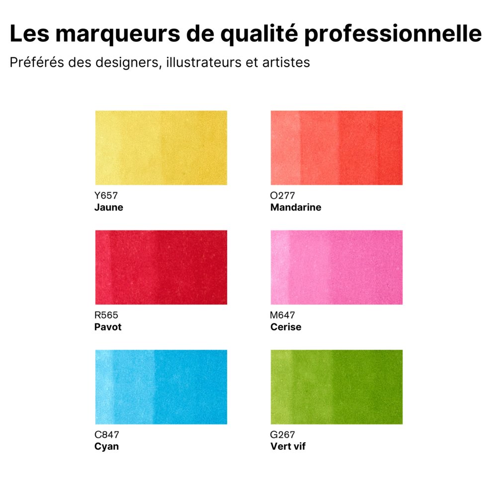 Pavot, Mandarine, Cyan, Vert Vif, Jaune et Cerise figurent parmi les couleurs les plus vives du large spectre de couleurs Promarker. Ensemble, elles forment une palette intense, parfaite pour les compositions les plus éclatantes. Comme pour tous les sets Promarker, celui-ci a été spécifiquement conçu pour offrir aux illustrateurs et artistes de belles couleurs, chaque jour.
