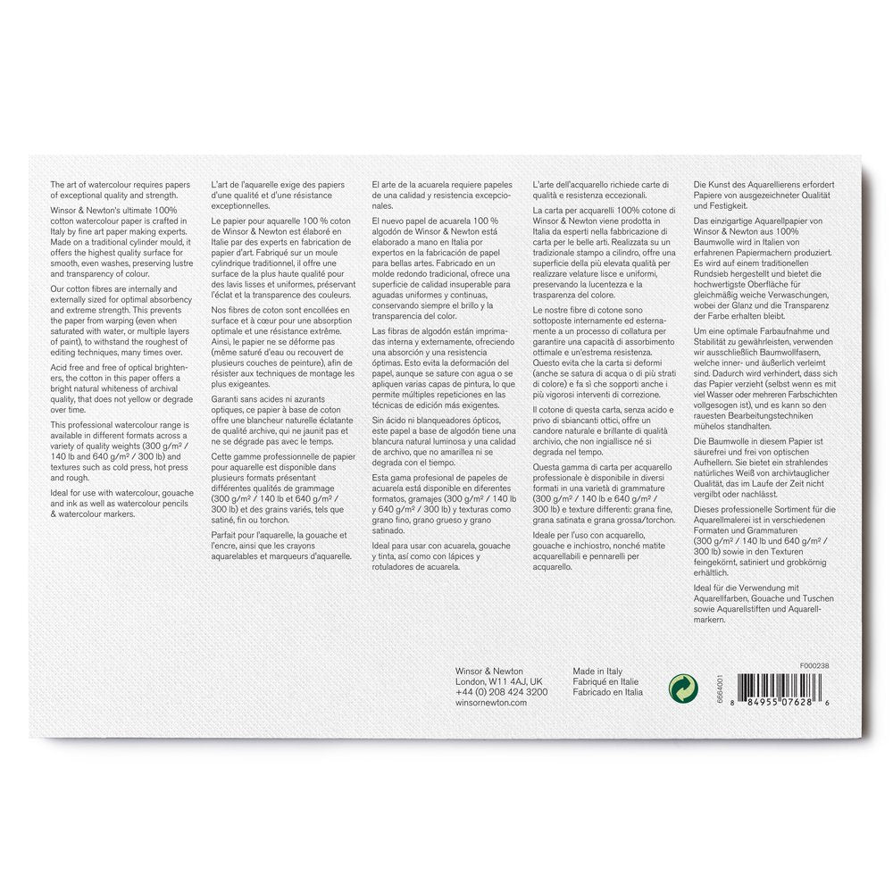 Le papier grain torchon présente un grain prononcé pour réaliser des peintures aquarelle avec le plus de texture et d'effets de granulation. Formé sur un moule cylindrique traditionnel, notre papier pour aquarelle donne l'apparence d'être fait à la main. Tous nos papiers pour aquarelle sont conçus pour résister à la saturation, et ce bloc encollé maintient le papier tendu pendant qu'il sèche. L'oeuvre achevée est ensuite retirée sans aucune déformation. Chaque bloc contient 20 feuilles de papier de 300 g/m².