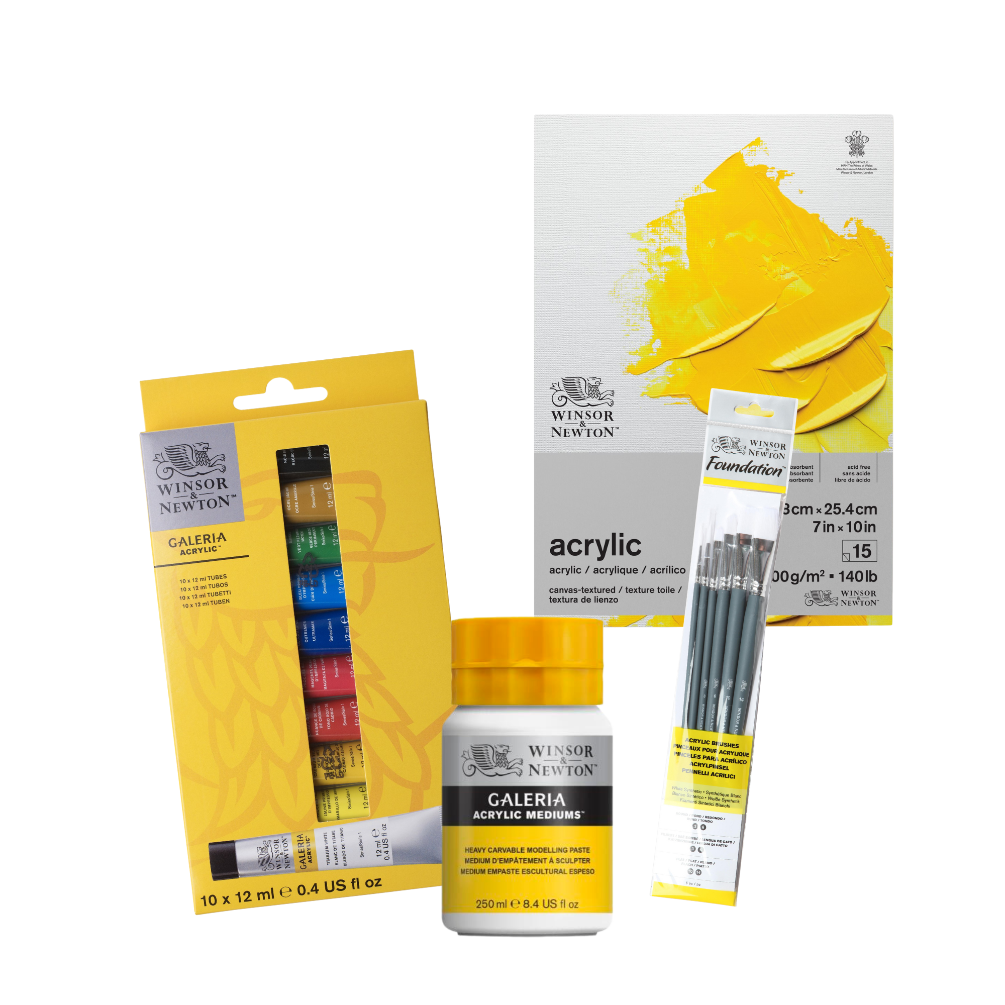 Ce bundle acrylique réunit les peintures acryliques Galeria, une pâte de modelage, des pinceaux de haute qualité et un bloc pour l’acrylique — tout le nécessaire pour expérimenter la couleur, la texture et les superpositions. À séchage rapide et faciles à utiliser, ces produits sont parfaits pour celles et ceux prêts à explorer des techniques acryliques audacieuses et une peinture expressive.