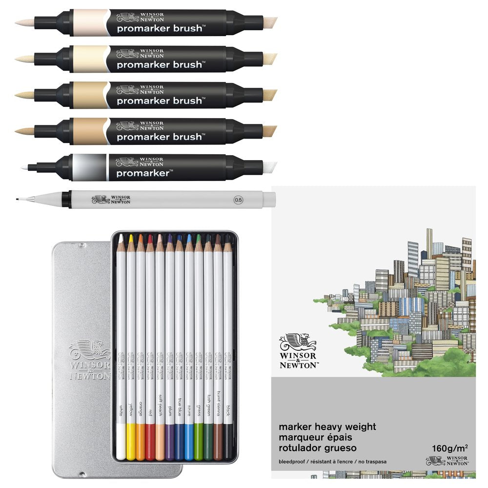 | Contenu du set: | 4 x Promarker Brush (Blush, Satin, Cinnamon, Praline) 1 x Promarker (Blender) 1 x Fineliner (Black 0.5) 12 x Colour pencils 1 x Bleed proof paper |
