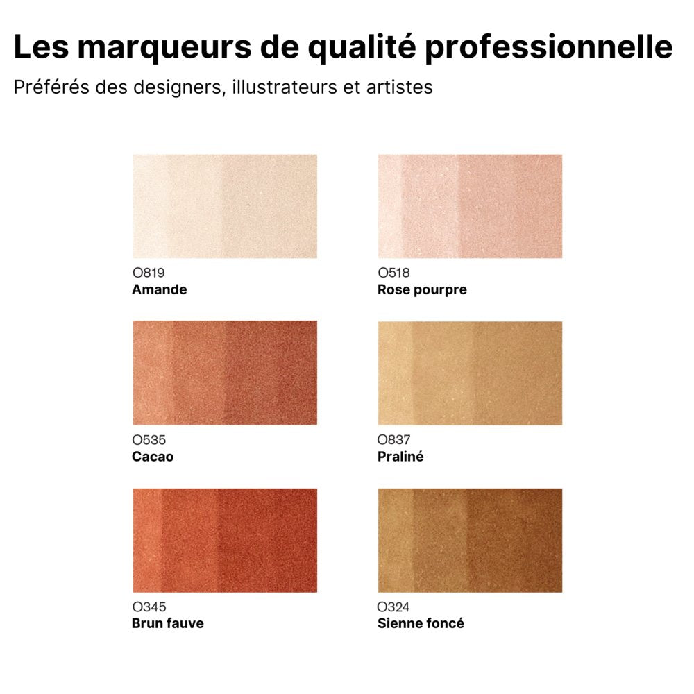 De l'Amande au Sienne Foncé, le set Promarker Brush Teint Chair vous permet d'explorer une multitude de carnations. Il inclut également Rose Pourpre, Cacao, Praliné et Brun Fauve. Pour varier les nuances, chaque couleur peut également être utilisée avec le Blender incolore, ou avec d'autres teintes du large spectre Promarker Brush. Comme pour tous les sets Promarker Brush, nos 6 Tons de Peau ont été spécifiquement sélectionnés pour se compléter et élargir votre collection de couleurs.
